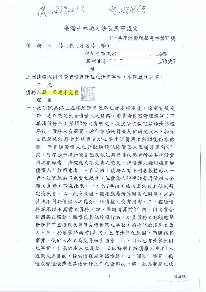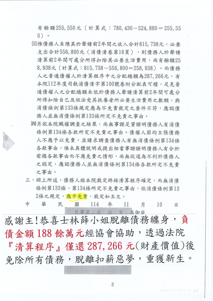 經法院裁定清算免責認可確定,以287,266元 成功免除188餘萬元債務的還款責任!